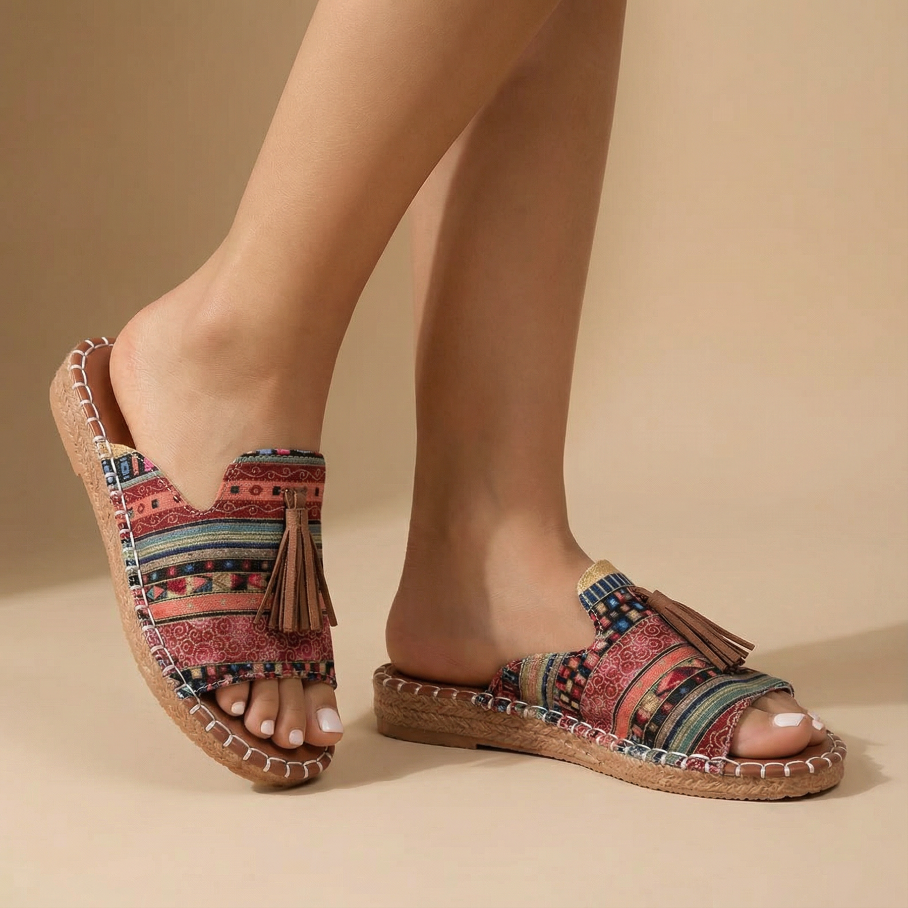 The Olivia - Ergonomic Sandals are your statement-making essential for warm days and laid-back adventures. With a vibrant woven design and tassel charm, these sandals pair personality with pure comfort.