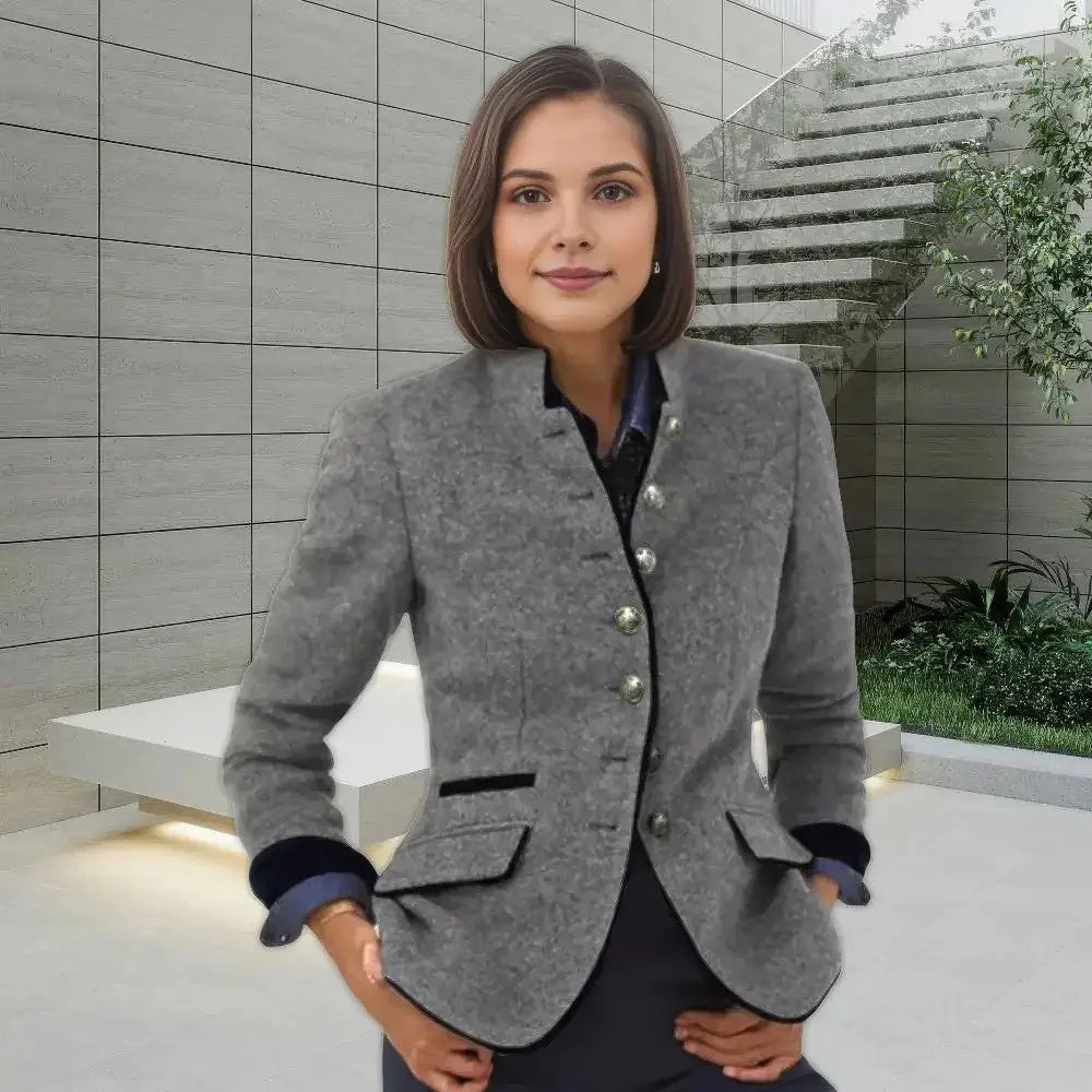 The Margaux - Timeless Elegance Jacket is crafted to bring sophistication into your everyday wardrobe. With its tailored structure, stand-up collar, and striking gold-toned buttons, this jacket embodies both classic heritage and modern chic. The subtle contrast trim adds a touch of refinement, making it the perfect piece for professional settings or upscale casual wear.